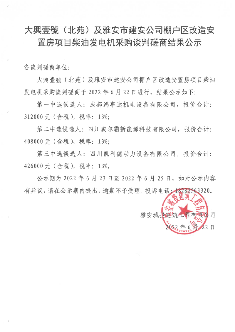 大興壹號(北苑)及雅安市建安公司棚戶區(qū)改造安置房項目柴油發(fā)電機(jī)采購談判磋商結(jié)果公示