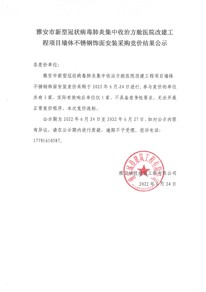 雅安市新型冠狀病毒肺炎集中收治方艙醫(yī)院改建工程項(xiàng)目墻體不銹鋼飾面安裝采購競價(jià)結(jié)果公示