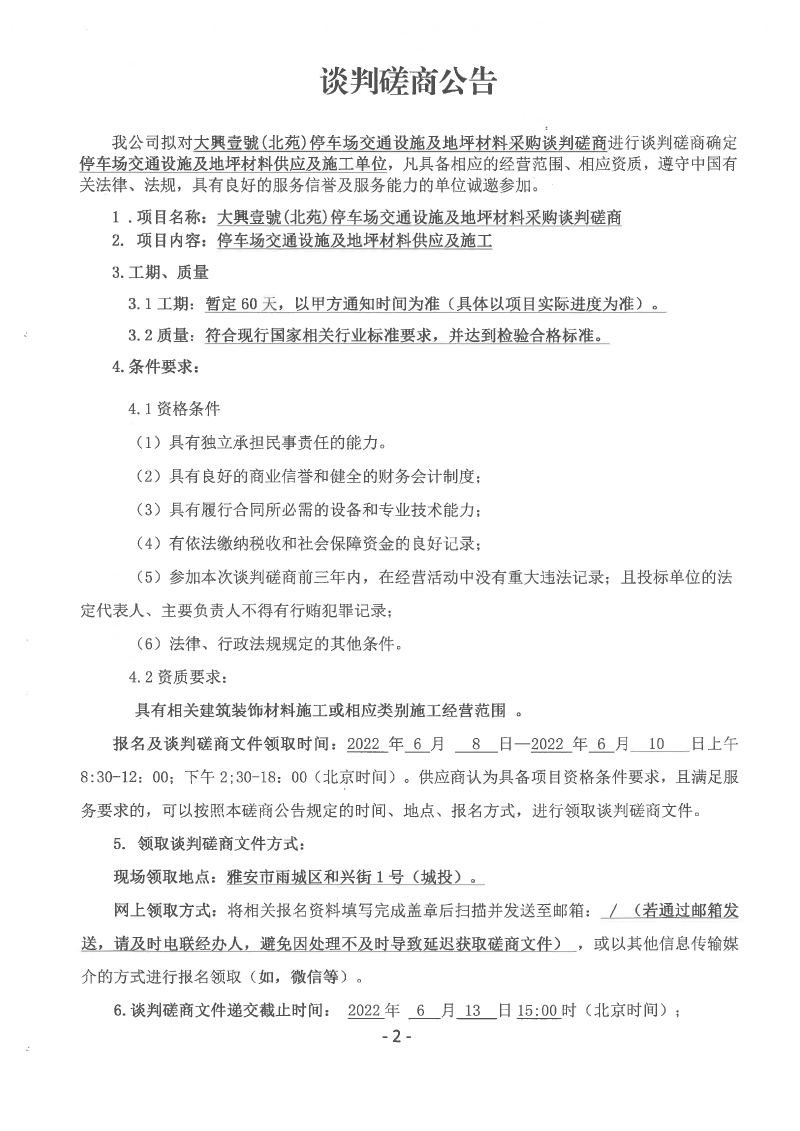 大興壹號(北苑)停車場交通設施及地坪材料采購談判磋商公告