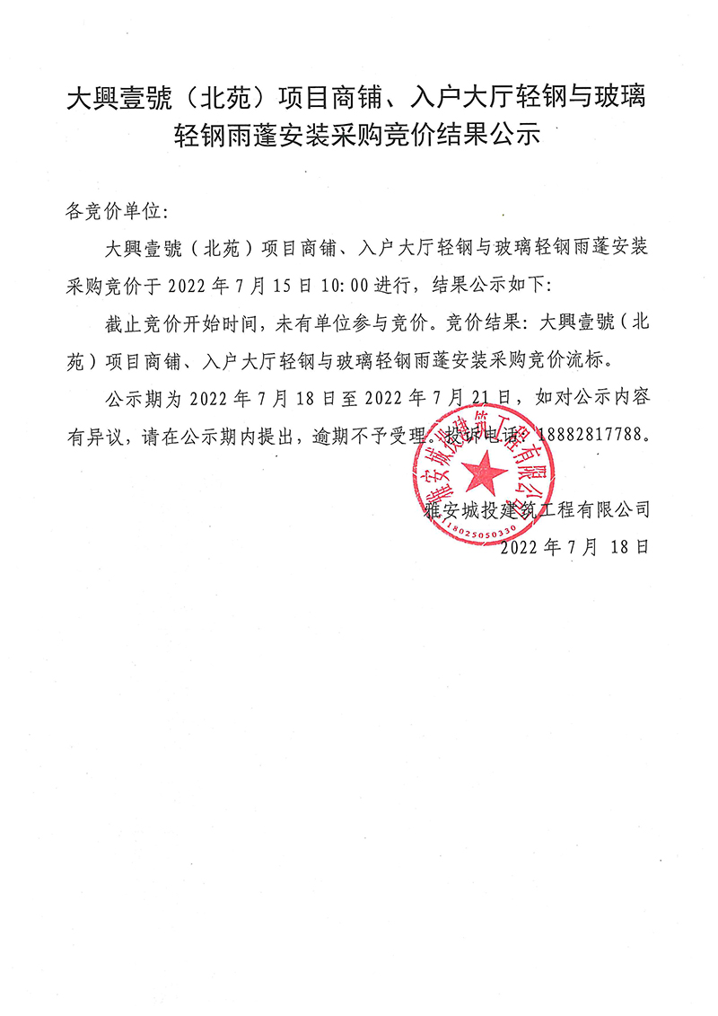 大興壹號(北苑)項目商鋪、入戶大廳輕鋼與玻璃輕鋼雨蓬安裝采購競價結(jié)果公示
