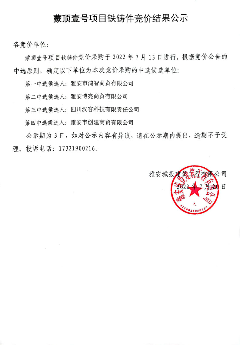 蒙頂壹號(hào)項(xiàng)目鐵鑄件競(jìng)價(jià)結(jié)果公示