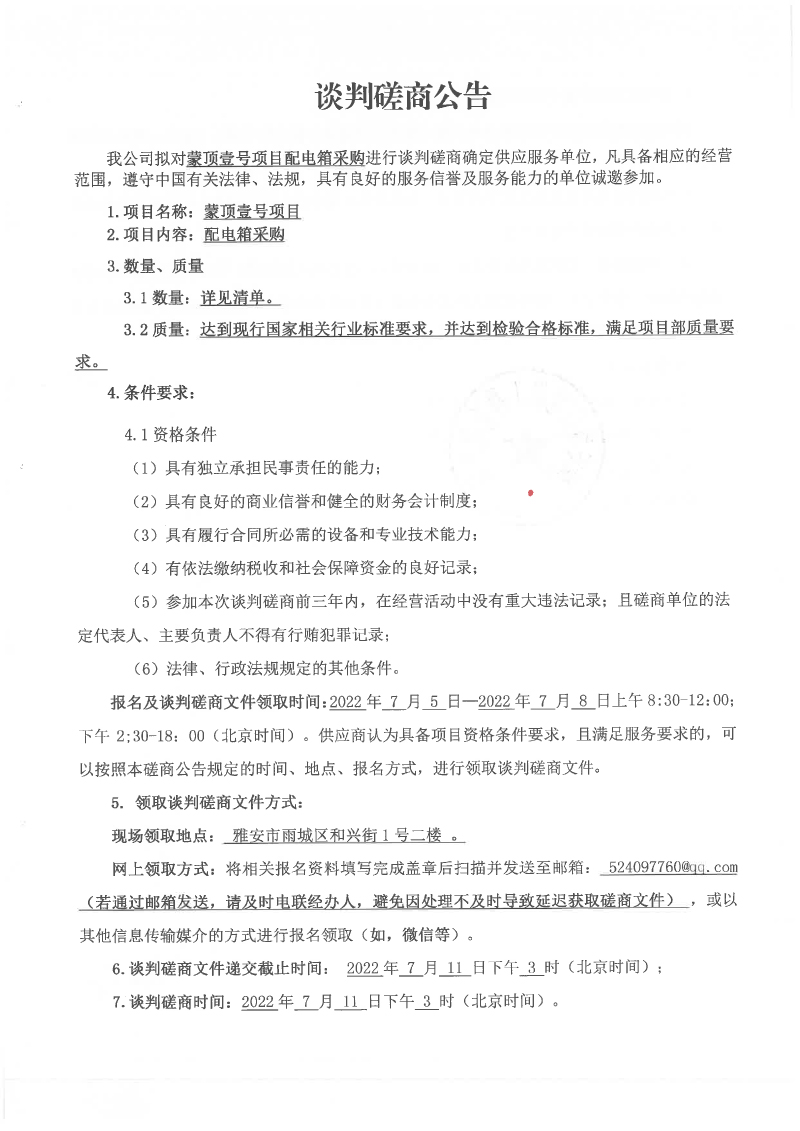 蒙頂壹號項(xiàng)目配電箱采購談判磋商公告
