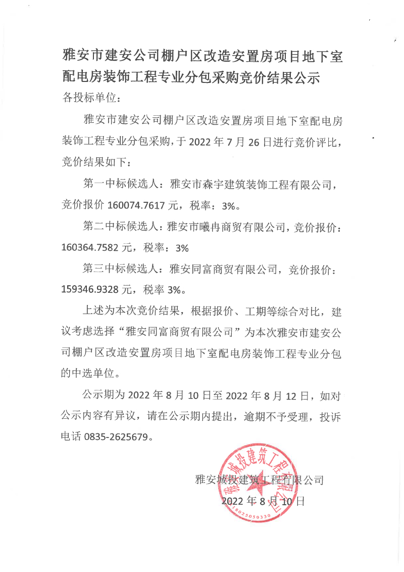 雅安市建安公司棚戶區(qū)改造安置房項(xiàng)目地下室配電房裝飾工程專業(yè)分包競價(jià)結(jié)果公示