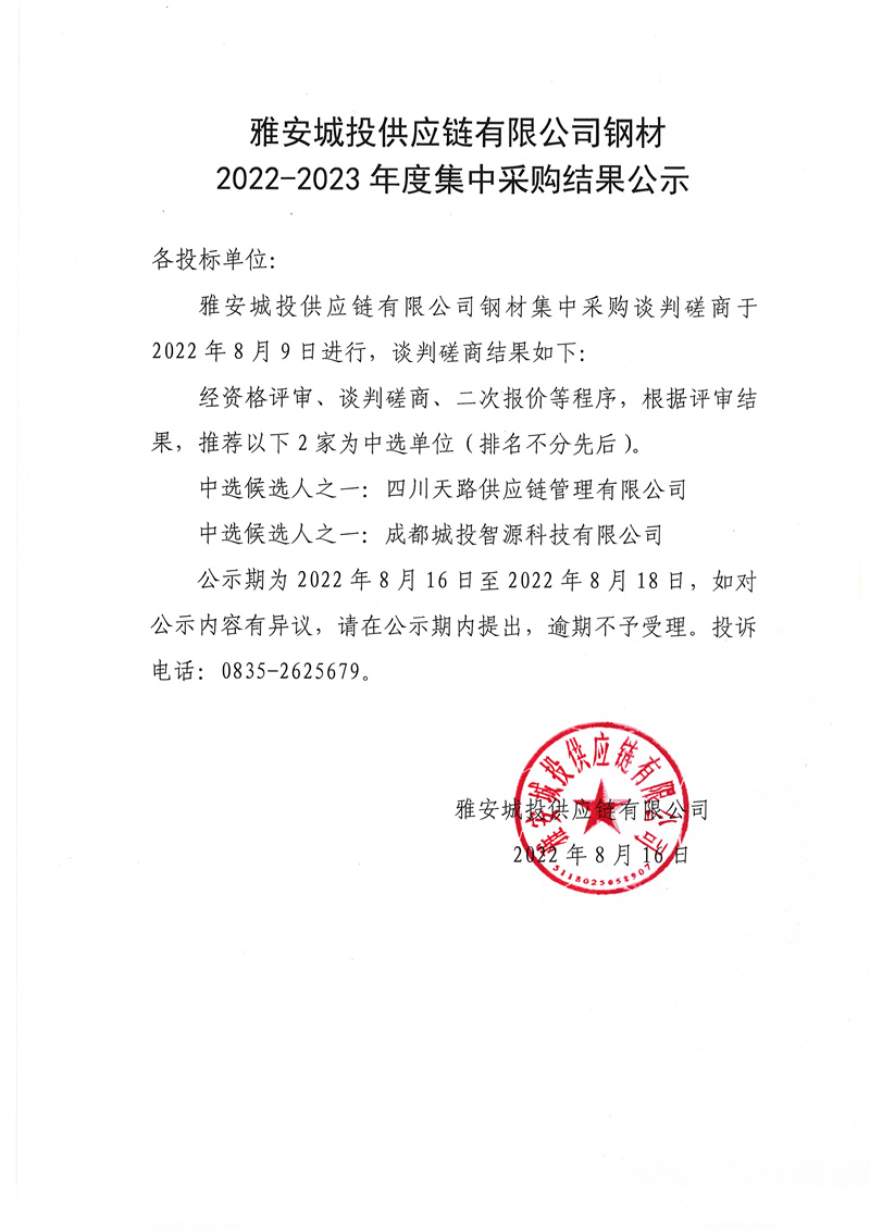 雅安城投供應鏈有限公司鋼材2022-2023年度集中采購結(jié)果公示
