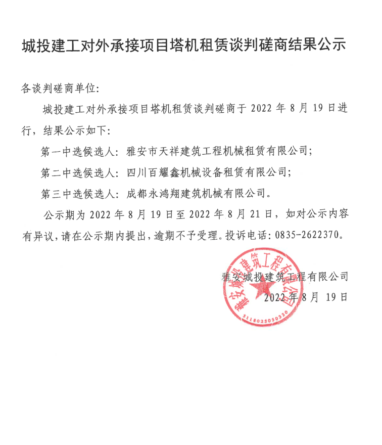 城投建工對外承接項目塔機租賃談判磋商結(jié)果公示