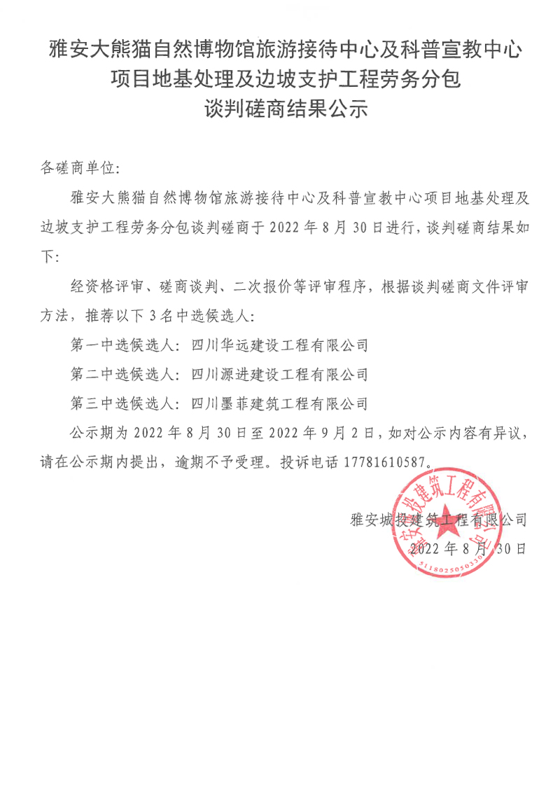 雅安大熊貓自然博物館旅游接待中心及科普宣教中心項目地基處理及邊坡支護(hù)工程勞務(wù)分包談判磋商結(jié)果公示
