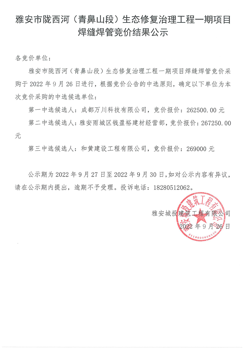 雅安市隴西河(青鼻山段)生態(tài)修復(fù)治理工程一期項(xiàng)目焊縫焊管采購(gòu)競(jìng)價(jià)結(jié)果公示