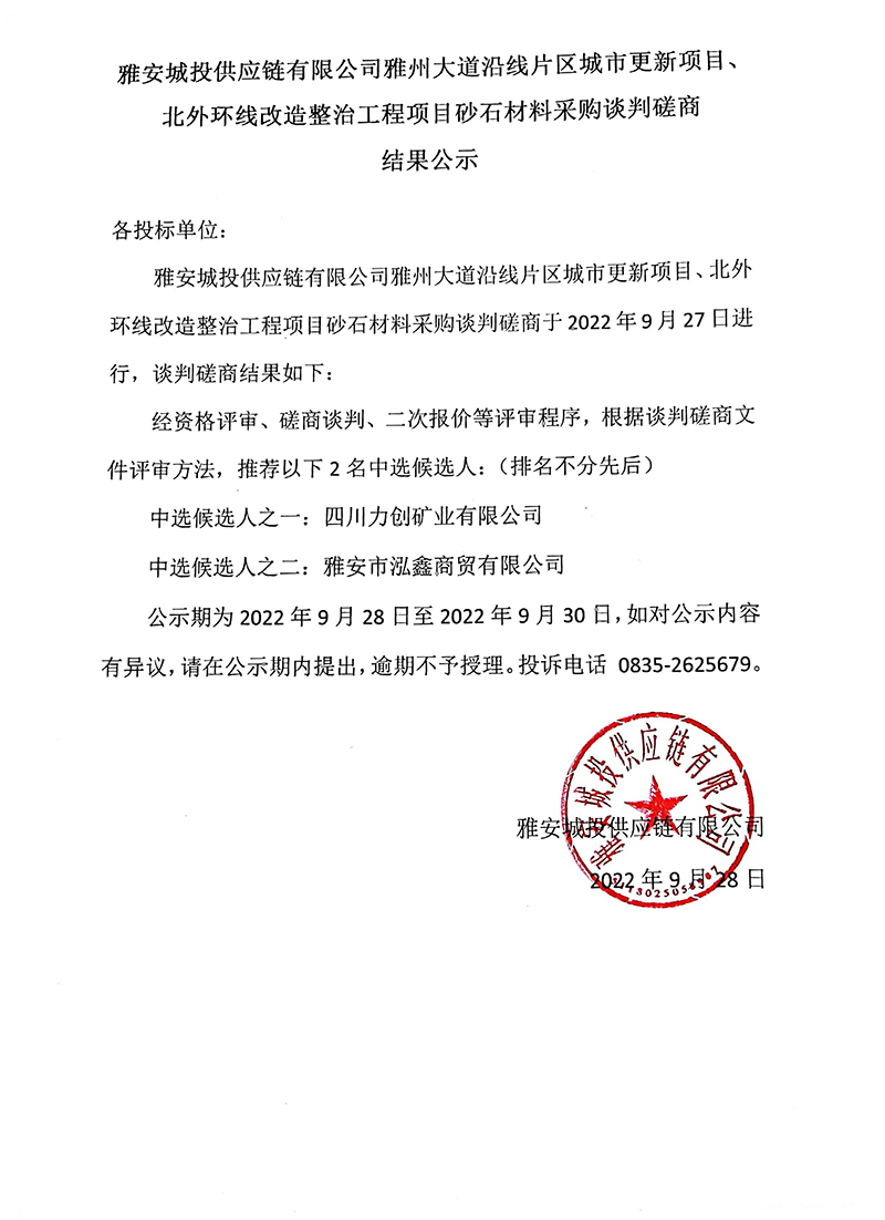 雅安城投供應鏈有限公司雅州大道沿線片區(qū)城市更新項目砂石材料采購談判磋商結果公示
