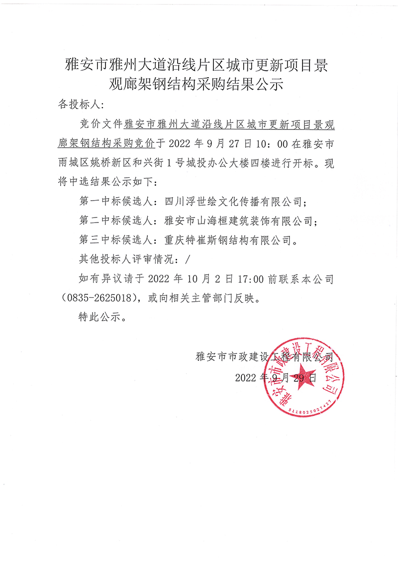 雅安市雅州大道沿線片區(qū)城市更新項目景觀廊架鋼結構采購結果公示
