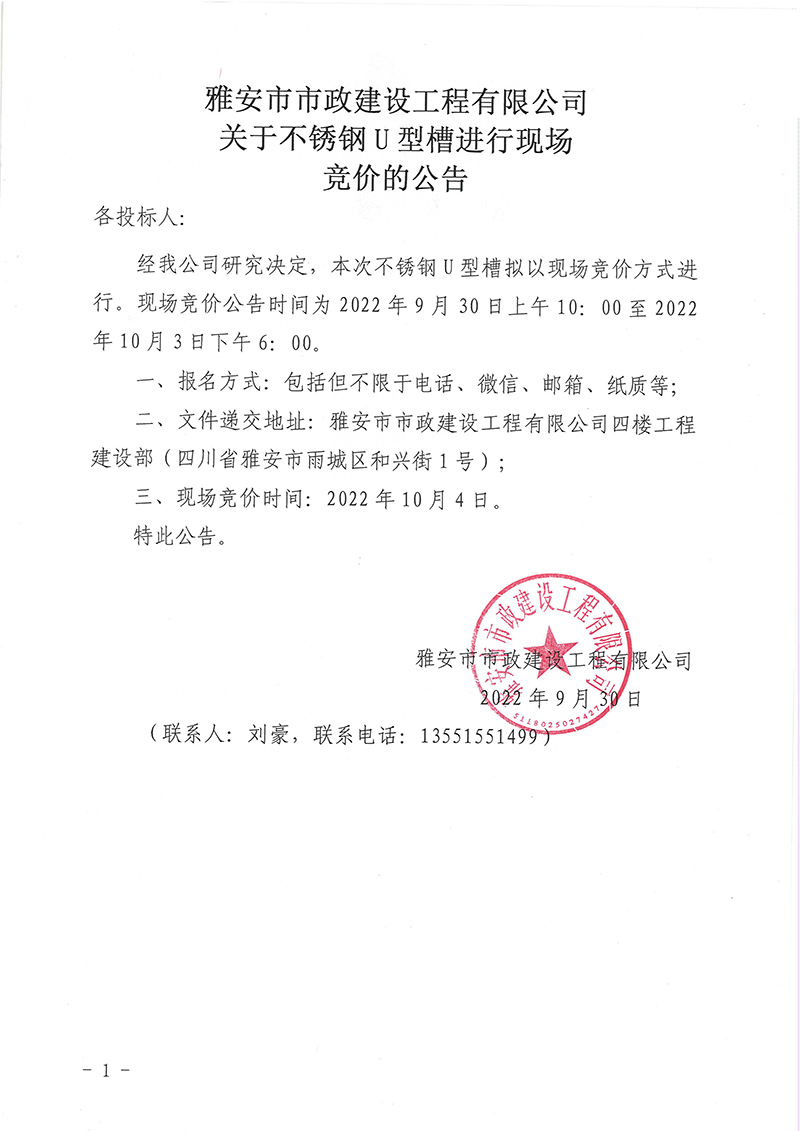 關(guān)于不銹鋼U型槽進行現(xiàn)場競價的公告