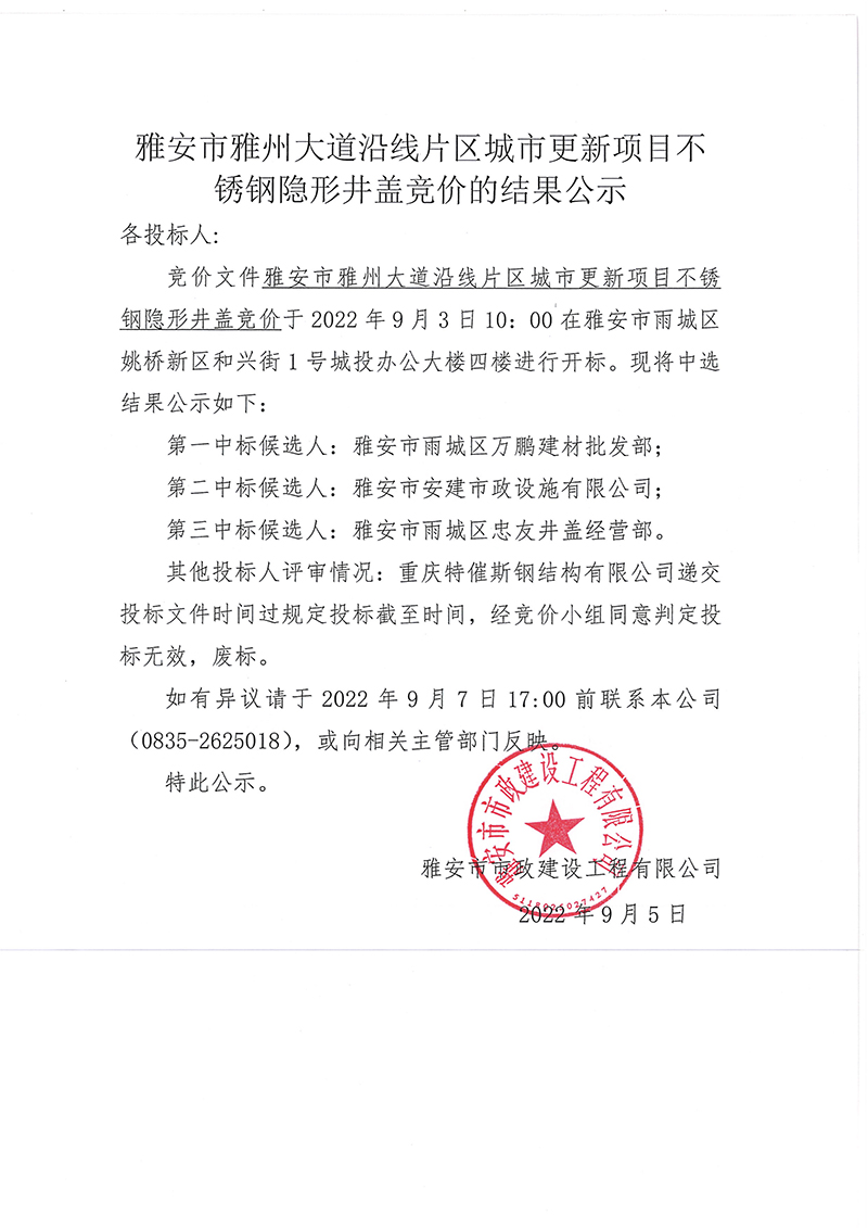 雅安市雅州大道沿線片區(qū)城市更新項(xiàng)目不銹鋼隱形井蓋競(jìng)價(jià)招采競(jìng)價(jià)的結(jié)果公示
