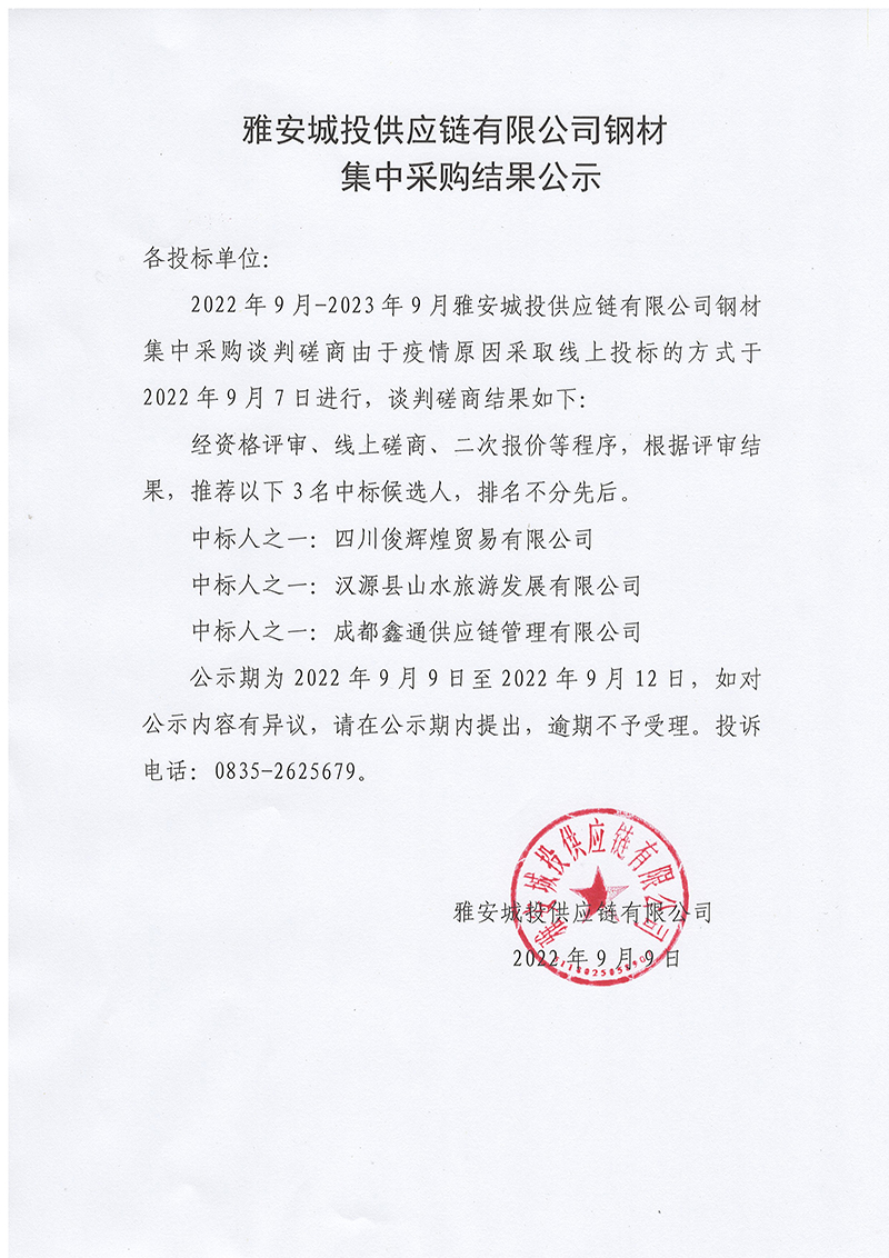 雅安城投供應鏈有限公司鋼材集中采購結(jié)果公示