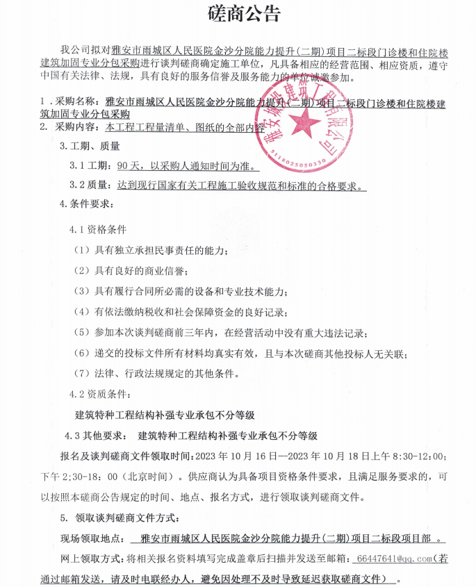 雅安市雨城區(qū)人民醫(yī)院金沙分院能力提升(二期)項目二標(biāo)段門診樓和住院樓建筑加固專業(yè)分包采購談判磋商公告