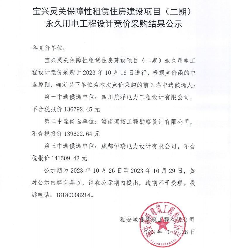 寶興靈關(guān)保障性租賃住房建設(shè)項(xiàng)目(二期)永久用電工程設(shè)計(jì)競(jìng)價(jià)采購(gòu)結(jié)果公示