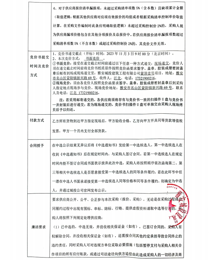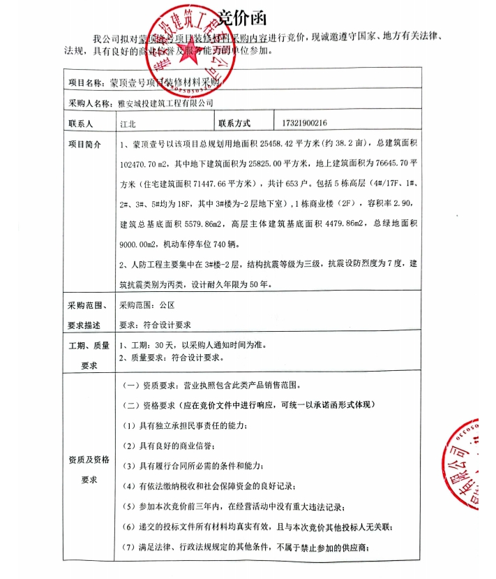 蒙頂壹號項目裝修材料采購競價公告