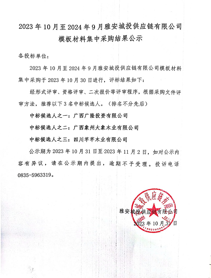 203年10月至2024年9月雅安城投供應鏈有限公司模板材料集中采購結果公示