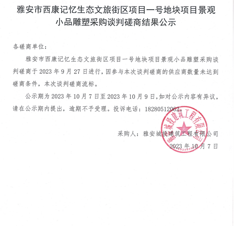 雅安市西康記憶生態(tài)文旅街區(qū)項目一號地塊項目景觀小品雕塑采購談判磋商結(jié)果公示