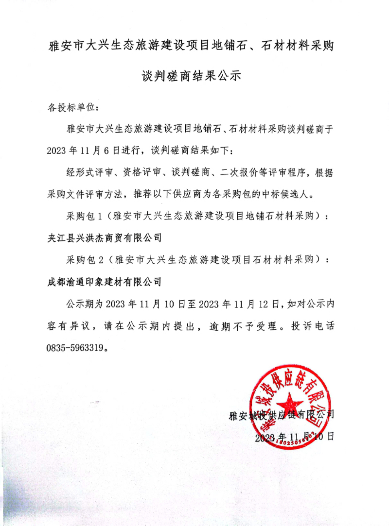 雅安市大興生態(tài)旅游建設項目地鋪石、石材材料采購談判磋商結果公示