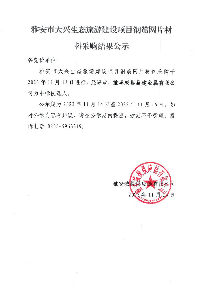 雅安市大興生態(tài)旅游建設(shè)項(xiàng)目鋼筋網(wǎng)片材料采購(gòu)結(jié)果公示