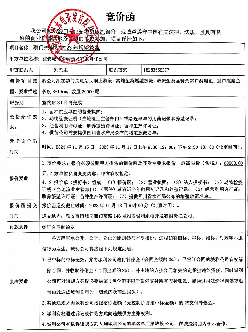 禁門關(guān)電站2023年增殖放流競價(jià)公告