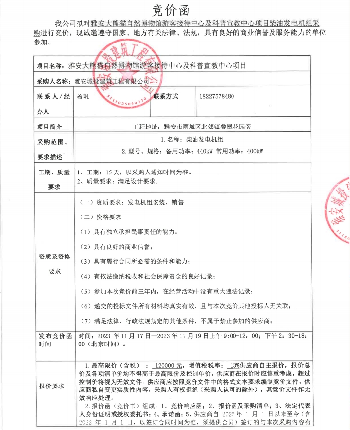 雅安大熊貓自然博物館游客接待中心及科普宣教中心項(xiàng)目柴油發(fā)電機(jī)組采購(gòu)競(jìng)價(jià)公告