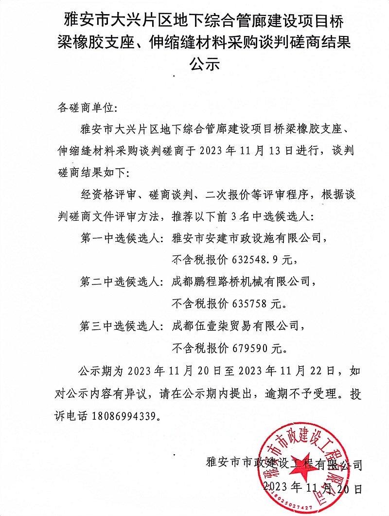 雅安市大興片區(qū)地下綜合管廊建設(shè)項(xiàng)目橋梁橡膠支座、伸縮縫材料采購(gòu)談判磋商結(jié)果公示