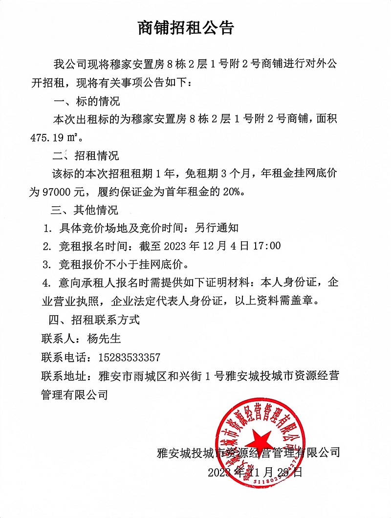 穆家安置房8棟2層1號(hào)附2號(hào)商鋪招租公告