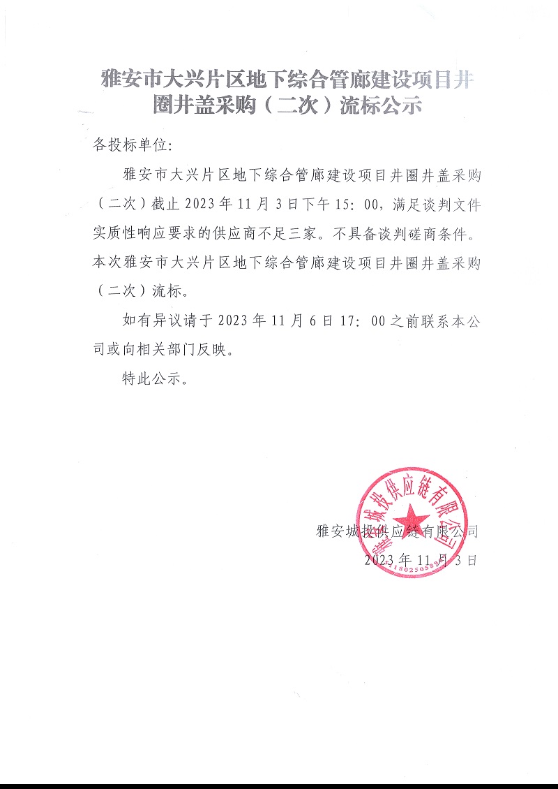 雅安市大興片區(qū)地下綜合管廊建設項目井圈井蓋采購(二次)流標公示