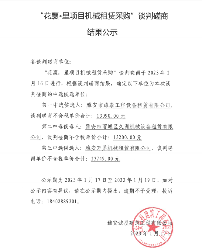 花襄·里項(xiàng)目機(jī)械租賃采購(gòu)談判磋商結(jié)果公示
