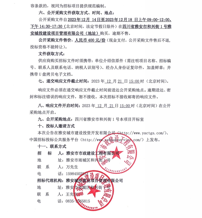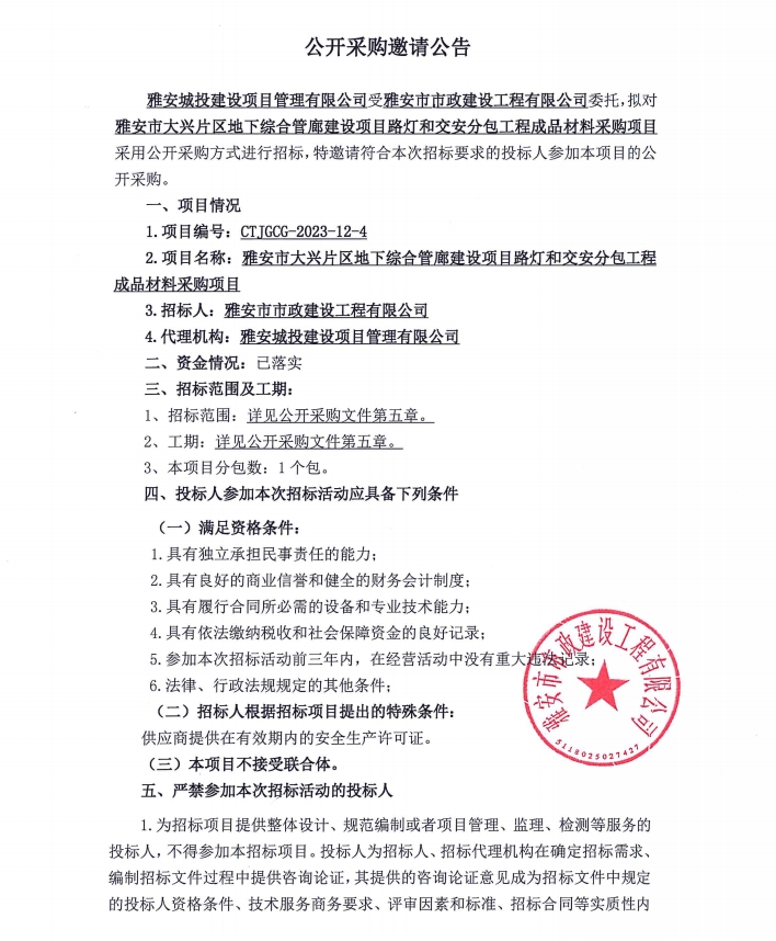 雅安市大興片區(qū)地下綜合管廊建設(shè)項(xiàng)目路燈和交安分包工程成品材料采購項(xiàng)目公開采購邀請(qǐng)公告