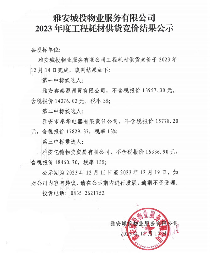 雅安城投物業(yè)服務有限公司2023年度工程耗材供貨競價結(jié)果公示