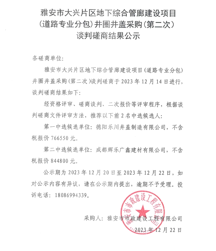 雅安市大興片區(qū)地下綜合管廊建設(shè)項目(道路專業(yè)分包)井圈井蓋采購(第二次)談判磋商結(jié)果公示