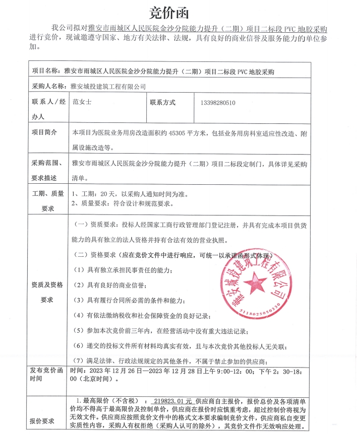 雅安市雨城區(qū)人民醫(yī)院金沙分院能力提升(二期)項(xiàng)目二標(biāo)段PVC地膠采購競(jìng)價(jià)公告