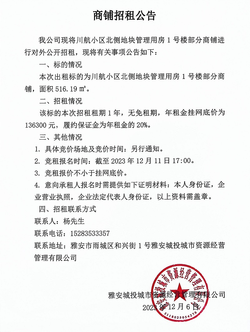 川航小區(qū)北側地塊管理用房1號樓部分商鋪招租公告