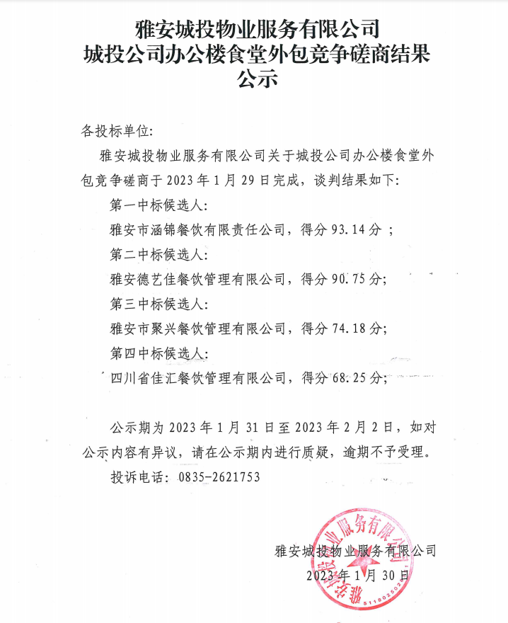 雅安城投物業(yè)服務(wù)有限公司城投公司辦公樓食堂外包競爭磋商結(jié)果公示
