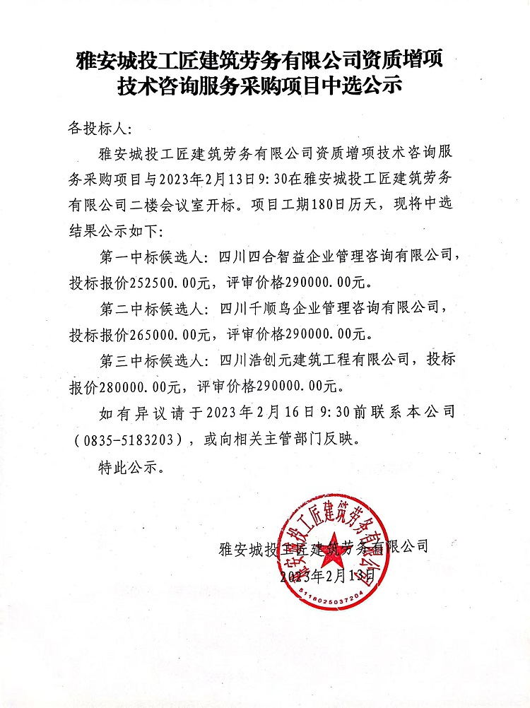 雅安城投工匠建筑勞務(wù)有限公司資質(zhì)增項(xiàng)技術(shù)咨詢服務(wù)采購(gòu)項(xiàng)目中選公示