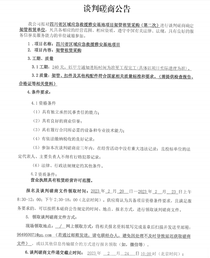 四川省區(qū)域應(yīng)急救援雅安基地項(xiàng)目架管租賃采購(第二次)談判磋商公告