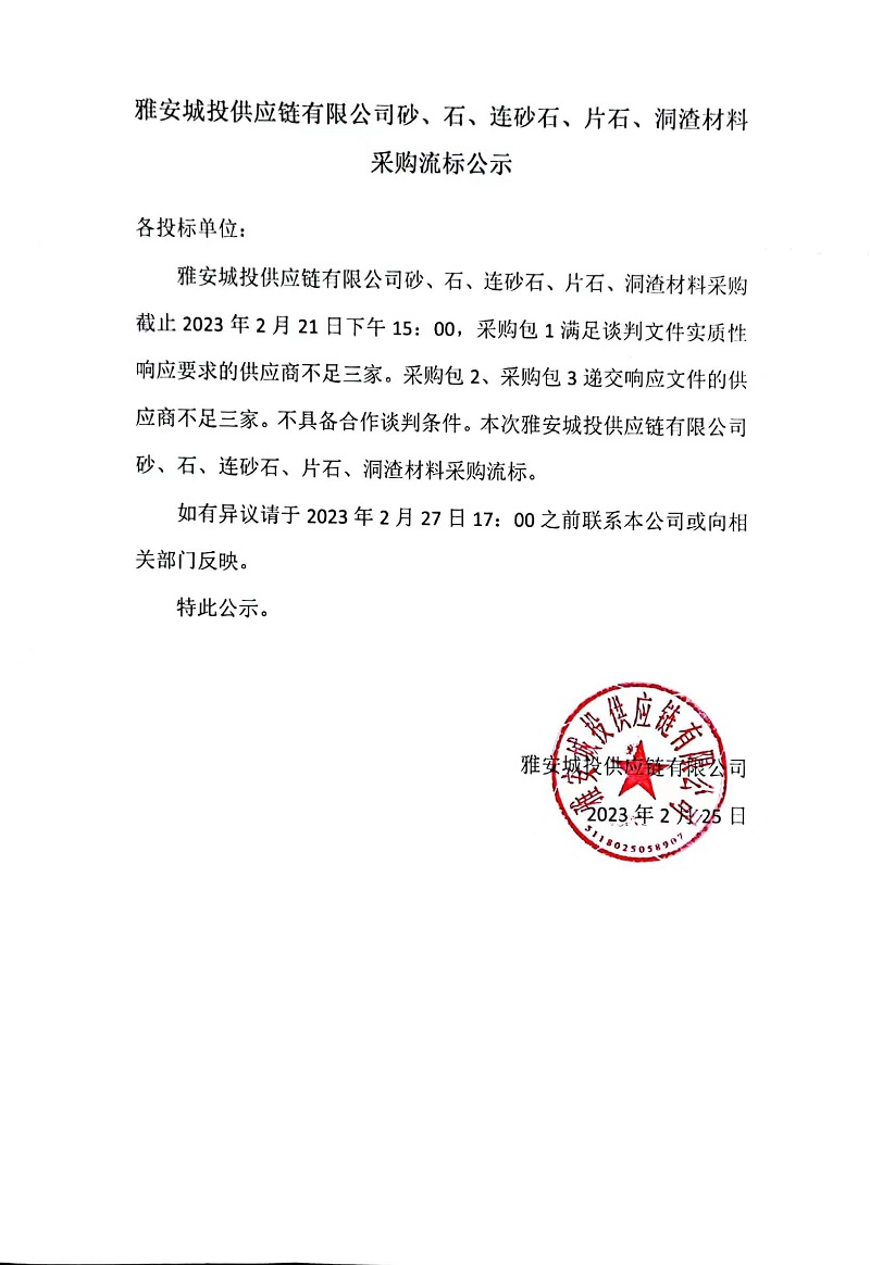 雅安城投供應(yīng)鏈有限公司砂、石、連砂石、片石、洞渣材料采購流標(biāo)公示