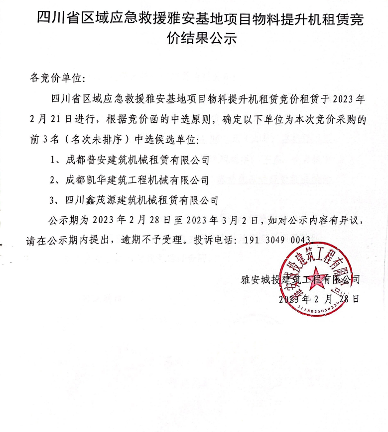 四川省區(qū)域應(yīng)急救援雅安基地項(xiàng)目物料提升機(jī)租賃競價結(jié)果公示