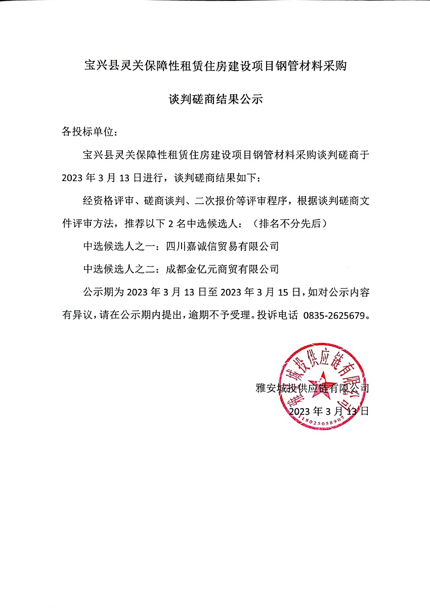寶興縣靈關(guān)保障性租賃住房建設(shè)項(xiàng)目鋼管材料采購談判磋商結(jié)果公示