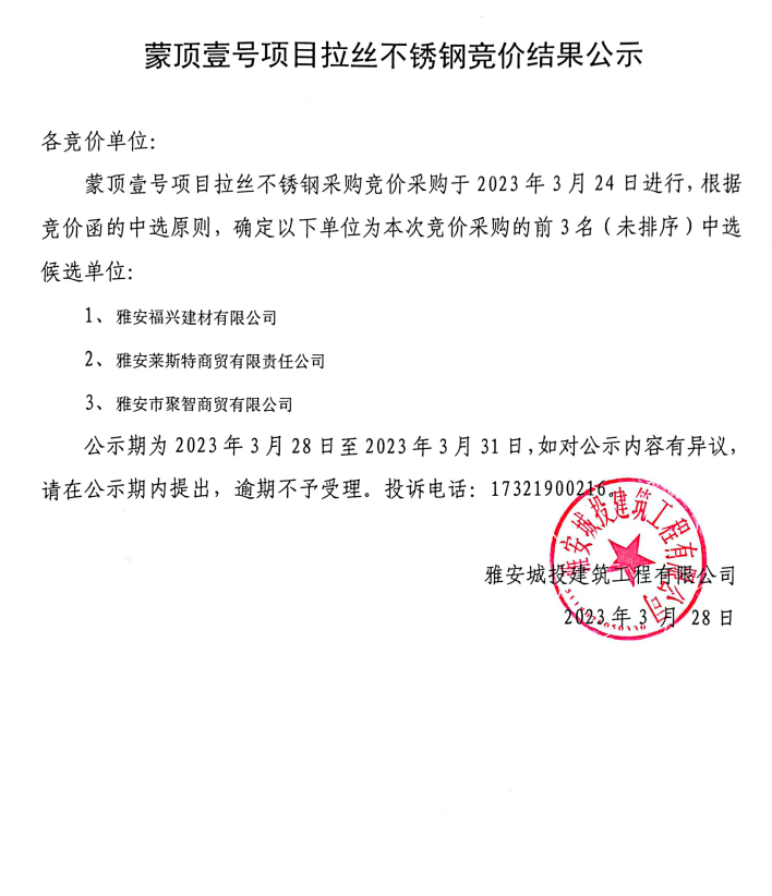 蒙頂壹號(hào)項(xiàng)目拉絲不銹鋼競價(jià)結(jié)果公示