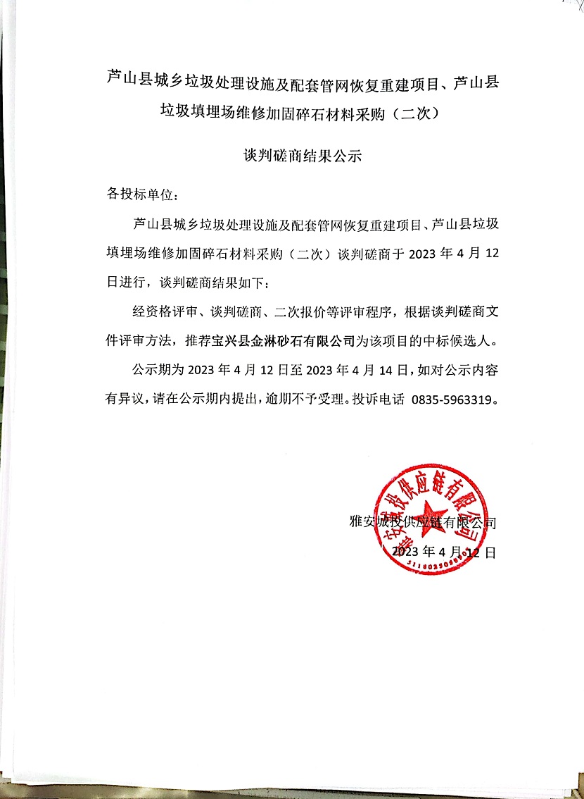 蘆山縣城鄉(xiāng)垃圾處理設(shè)施及配套管網(wǎng)恢復重建項目、蘆山縣垃圾填埋場維修加固碎石材料采購(二次)談判磋商結(jié)果公示