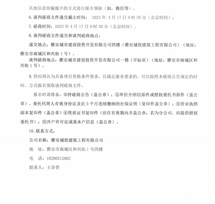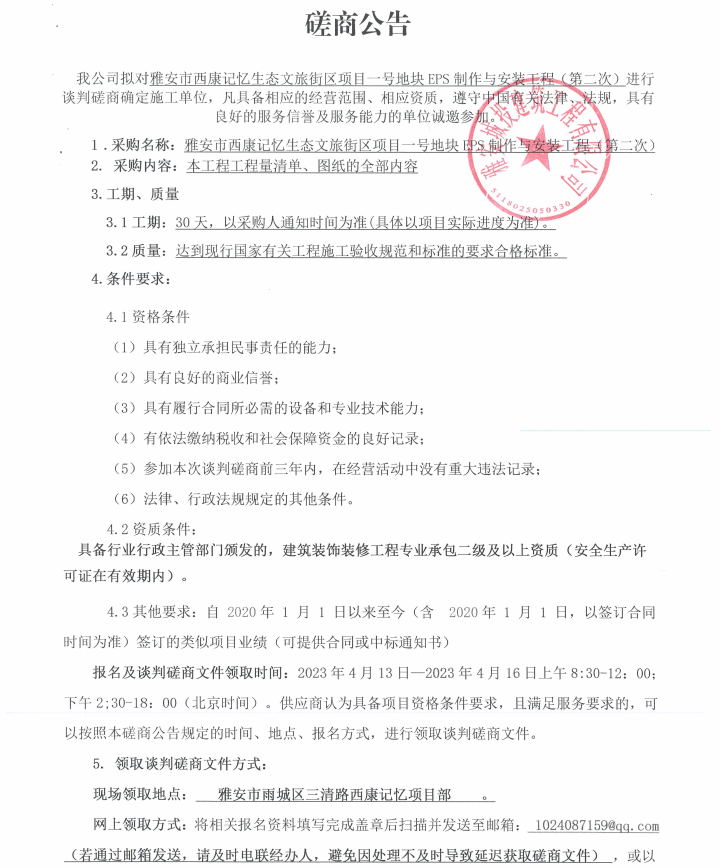 雅安市西康記憶生態(tài)文旅街區(qū)項(xiàng)目一號(hào)地塊項(xiàng)目EPS制作與安裝工程(第二次)采購(gòu)談判磋商公告