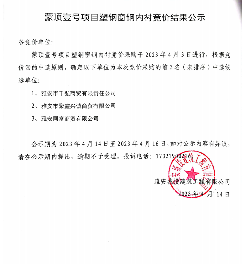 蒙頂壹號項目塑鋼窗內襯競價結果公示