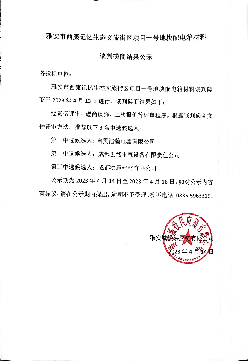 雅安市西康記憶生態(tài)文旅街區(qū)項目一號地塊配電箱材料談判磋商結(jié)果公示
