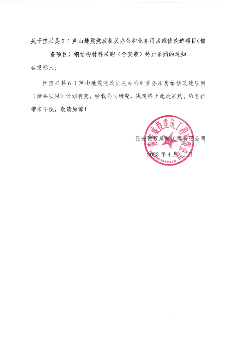 關(guān)于寶興縣6-1蘆山地震黨政機(jī)關(guān)辦公和業(yè)務(wù)用房維修改造項(xiàng)目(儲(chǔ)備項(xiàng)目)鋼結(jié)構(gòu)材料采購(gòu)(含安裝)終止采購(gòu)的通知