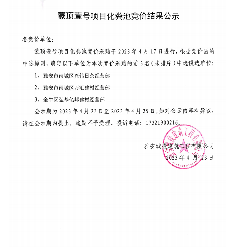 蒙頂壹號項(xiàng)目化糞池競價(jià)結(jié)果公示