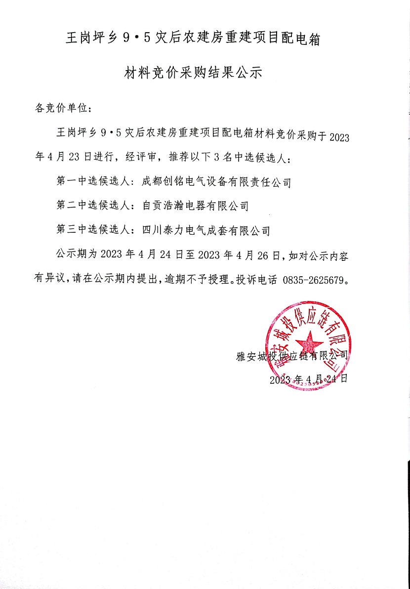 王崗坪鄉(xiāng)9·5災(zāi)后農(nóng)建房重建項(xiàng)目配電箱材料競價采購結(jié)果公示