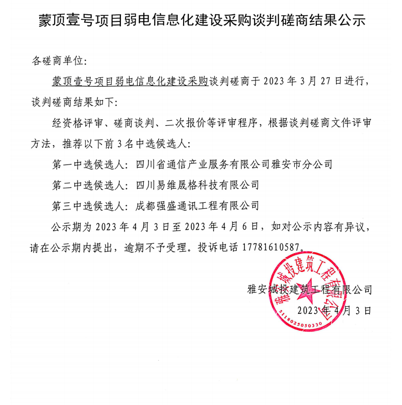 蒙頂壹號項目弱電信息化建設(shè)采購談判磋商結(jié)果公示