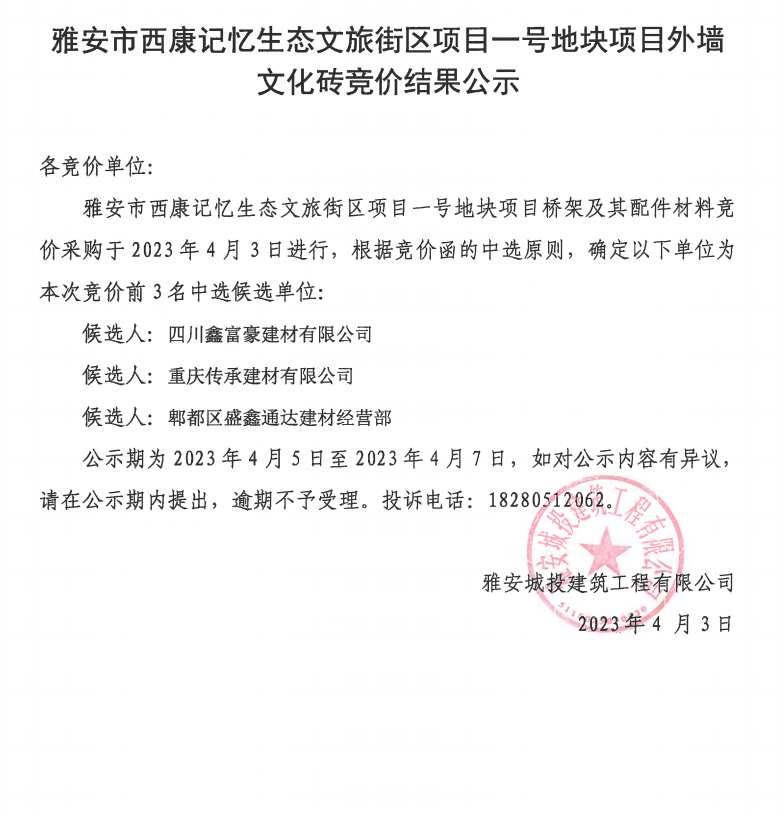 雅安市西康記憶生態(tài)文旅街區(qū)項目一號地塊項目外墻文化磚競價結(jié)果公示